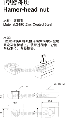 T型螺母塊可將其他連接件簡單安全地固定至型材槽上,裝配過程中,它能自動定位,自動鎖緊。